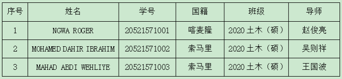 现有2020级土木水利三名国际研究生,按照培养方案规定,已于2025年7月达到最长学习年限,未如期完成培养环节要求及毕业论文答辩。根据《温州大学研究生学籍管理规定》(温大行政发〔2022〕123号)第七章第三十一条规定:“在规定期限(含批准延期)内未修完培养计划规定课程,或未完成学业的,应予退学”。学生信息如下: