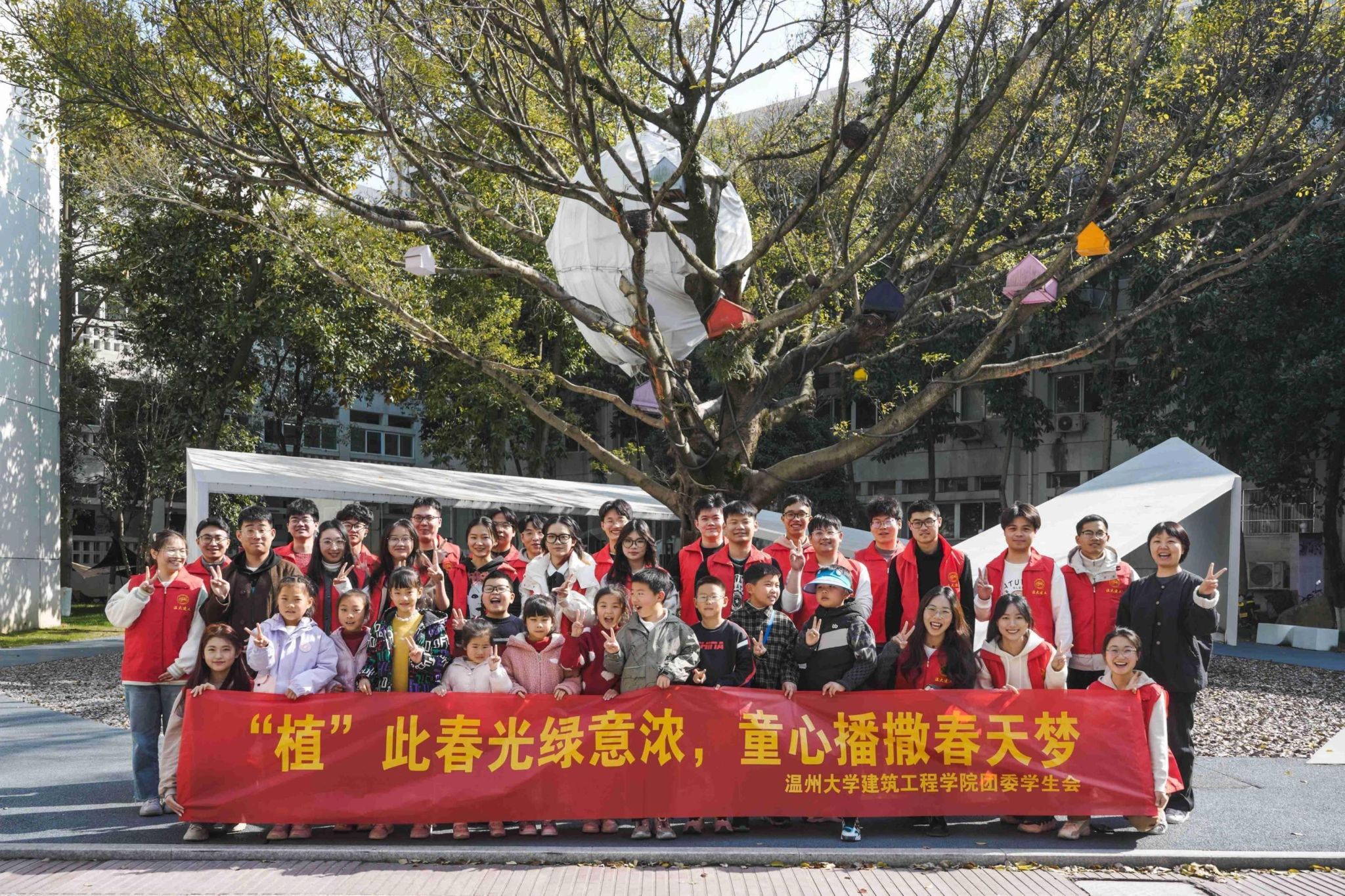 青年大学生与温州大学城附属学校的小学生们一起种树,一同学习植树节的由来和意义。