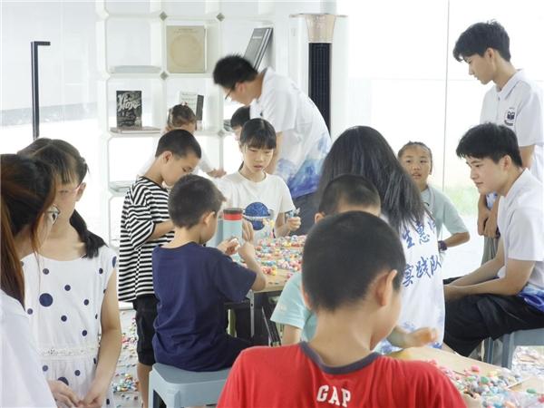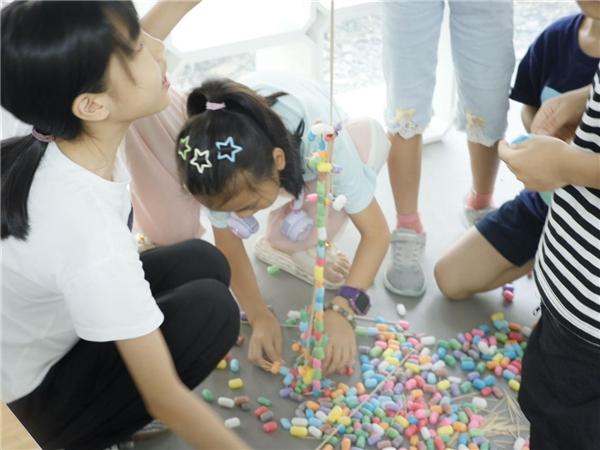 在温州大学榕亭书屋,温州大学暑期实践队和小朋友们一起开展了一堂“温大第一高楼”建设大比拼。活动利用牙签、木棍与彩色泡沫球搭接,进行“建设大比拼”,对比各组的搭建高度。