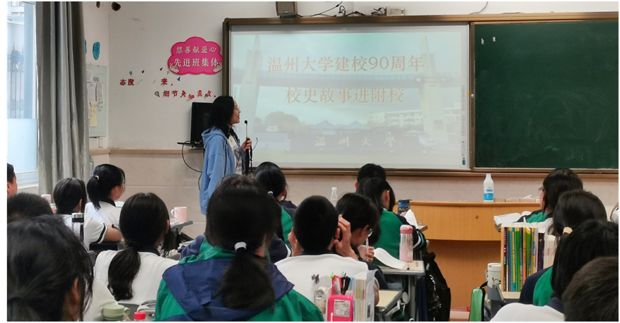 “我是中国人”双语创新实践团队队员在温大附中、仙岩二中及丽岙华侨小学三所中小学宣讲温大创校故事,为温大送上一份特别的生日祝贺。引导侨乡少年通过学习“三元券”筹资建校等温大校史故事,加深对温大发展与温州历史的了解,培养拼搏奋斗的精神与团结奉献的意识。