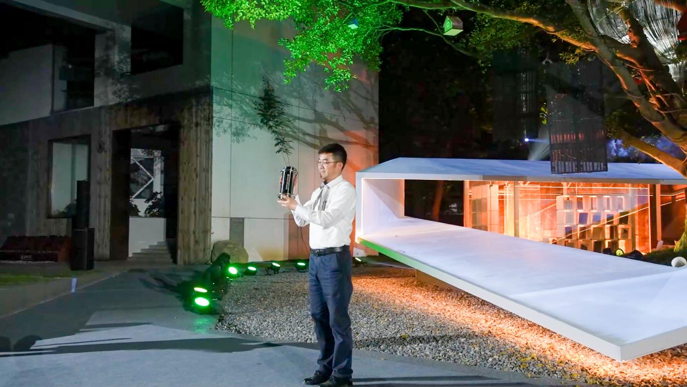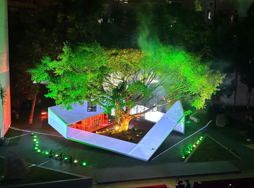 灯光秀以“一源、二境、三听、四景、五RONG”为创意,以榕树为线索,以莫比乌斯环为载体,书屋演化各种图案,配合星光闪烁、光点旋转、风铃鸟鸣雨声,将构筑物化为活演员,从宋演今,再向未来。