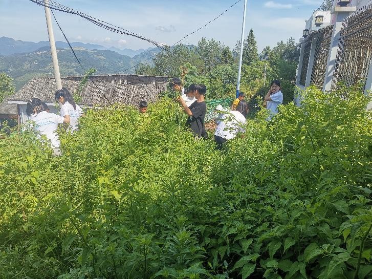 在凤栖楼前的百草园中,队员们与孩子们一起进行拔草劳动,在欢声笑语中感受植物清新的气息,在挥洒汗水中,一起体验劳动教育带来的乐趣。