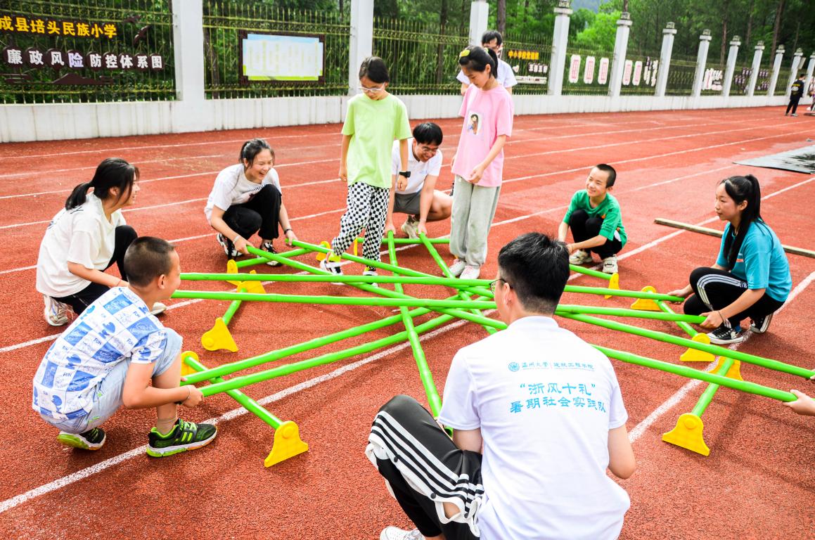 在培头民族小学的畲情文化室里,温州大学的学生们正在跟孩子们一起搭建“清风亭”模型。