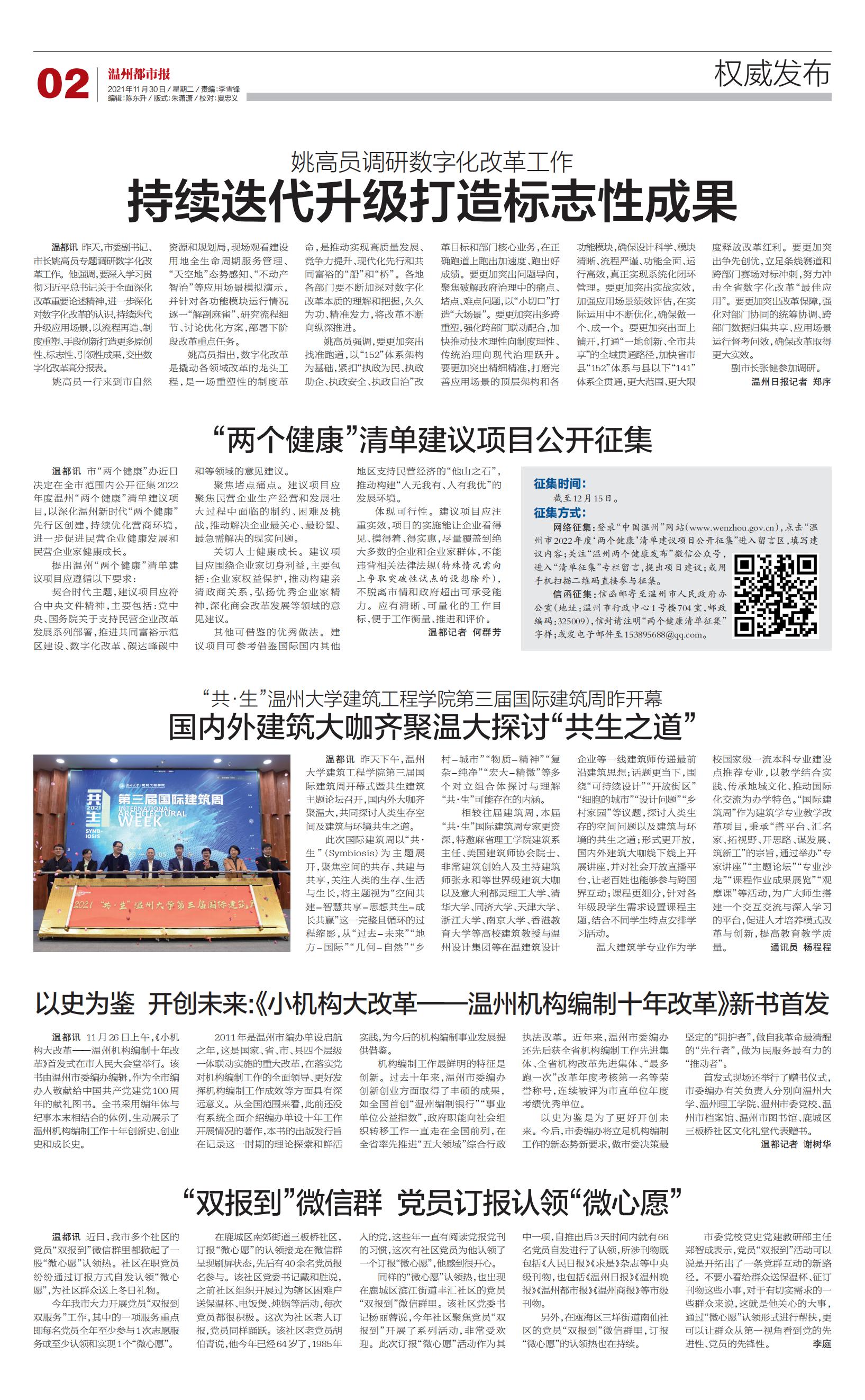 温大建筑学专业作为学校国家级一流本科专业建设点推荐专业,以教学结合实践、传承地域文化、推动国际化交流为办学特色。“国际建筑周”作为建筑学专业教学改革项目,秉承“搭平台、汇名家、拓视野、开思路、谋发展、 筑新工”的宗旨,通过举办“专家讲座”“主题论坛”“专业沙龙”“课程作业成果展览”“观摩课”等活动,为广大师生搭建一个交互交流与深入学习 的平台,促进人才培养模式改革与创新,提高教育教学质量。 通讯员 杨程程
