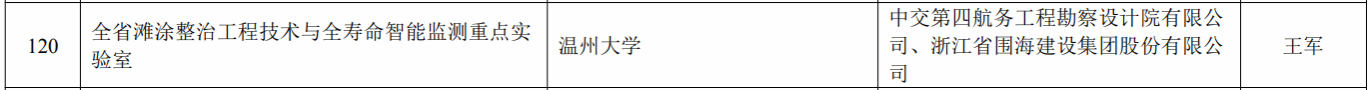 牵头,联合中交第四航务工程勘察设计院有限公司、浙江省围海建设集团股份有限公司共同组建的“全省滩涂整治工程技术与全寿命智能监测重点实验室”成功认定为全省重点实验室。