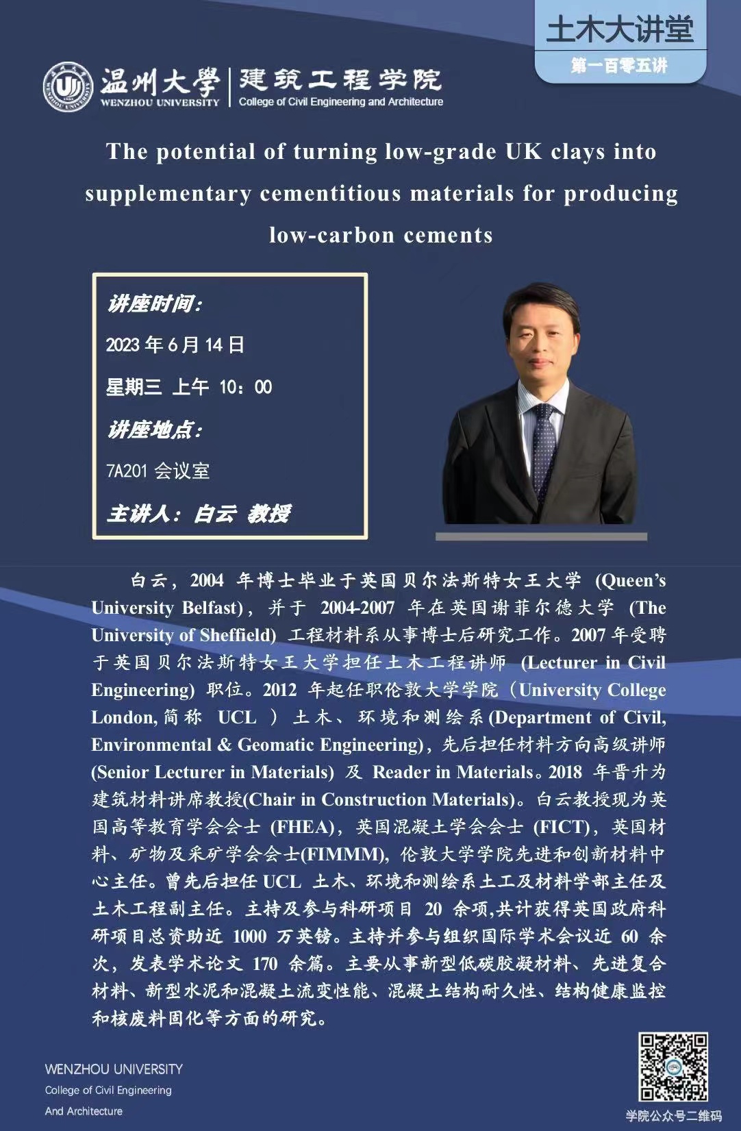 学术讲座预告:The potential of turning low-grade UK clays intosupplementary cementitious materials for producing low-carbon cements