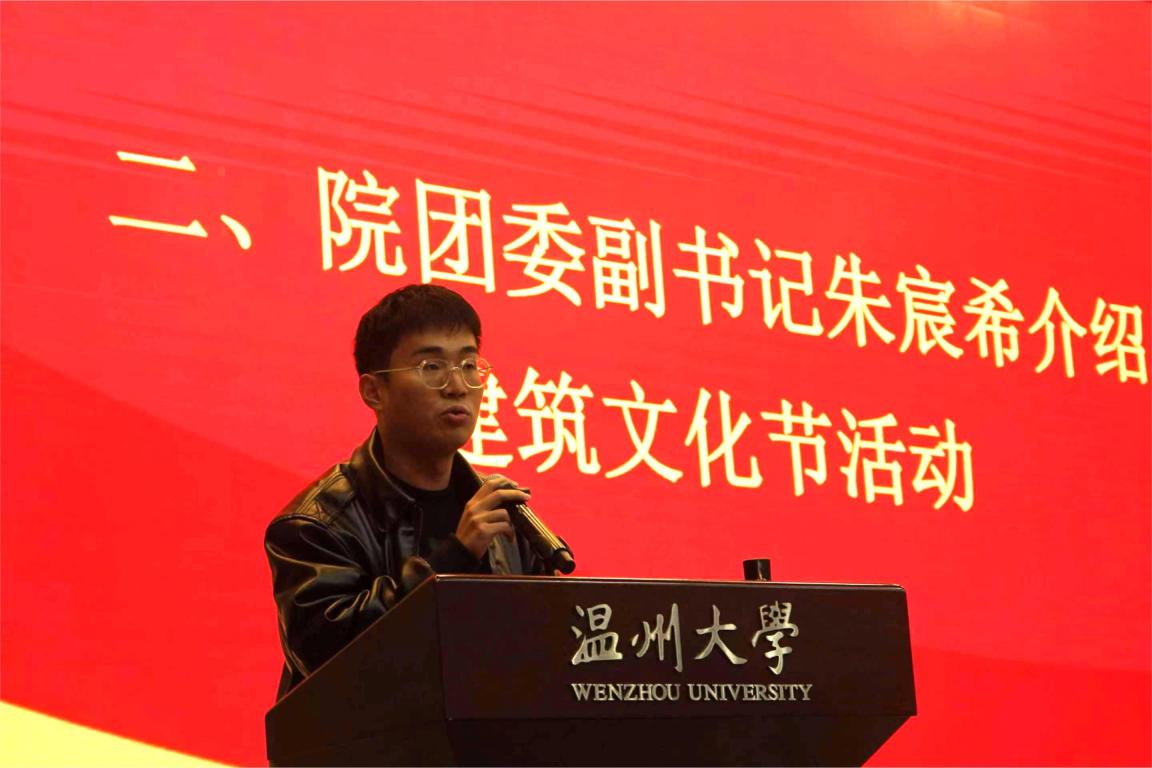 团委副书记朱宸希介绍建筑文化节活动安排。他指出,本届建筑文节突出学术性、专业性、健康性和示范性,内容包括“学术氛围,开拓思维”“文武双全,德才兼备”“文体盛会,青春律动”“榜样力量,筑力远航”“贴近职业,创意无限”等五大板块内容。活动历时近一年,通过丰富多样的各类活动,优化院风学风,繁荣校园文化,培育球探直播