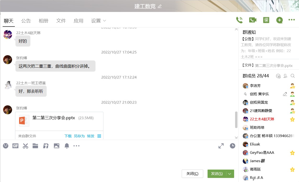 在本次培训中,张钧博做了充足准备,使用PPT向同学们介绍数学竞赛的含金量,并对竞赛的难度和重点题型进行讲解。培训会分为三场,分别对极限、重积分和曲面积分三大难点进行逐一培训,并通过真题解答进行“实战演练”,在每次培训结束后,张钧博同学还会为同学们提出的问题进行细致解答,并将PPT内容分享给同学们,以帮助同学们更好的钻研学习。