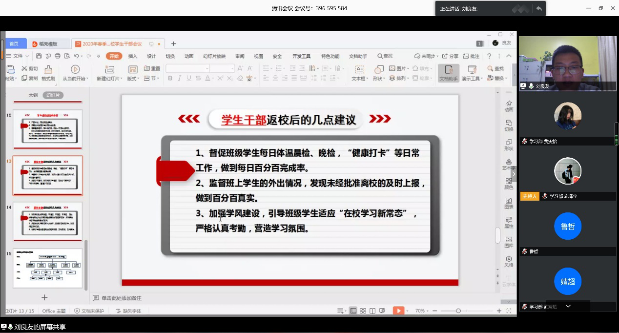 为新学期开学返校各项工作顺利开展,5月3日下午,我院通过线上平台召开了2020年春季学期工作会议。会议由球探直播团学学习部主办,球探直播团学指导老师、辅导员刘良友老师,团学全体成员以及全体班委出席了本次会议。
