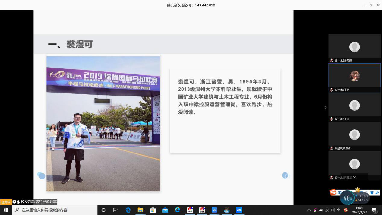 2020年3月27日晚上七点,我院本学期第一次“筑迹·校友印象”系列讲座以线上形式在腾讯会议进行。本次讲座有幸邀请到裘煜可、姜智超、高紫阳三位13级优秀学长为球探直播学子分享自己的考研心路历程,我院团委书记潘莉莉老师参加交流会。