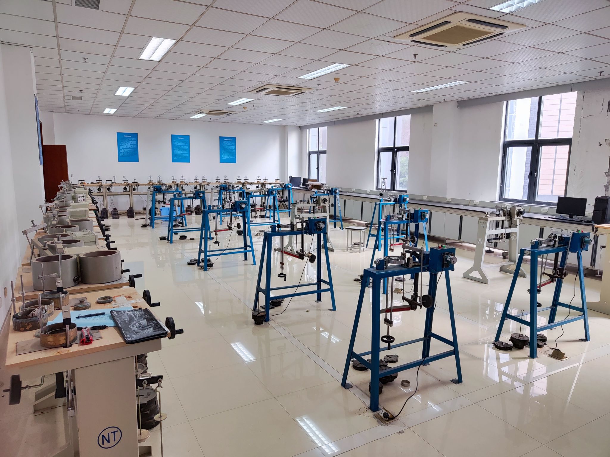 剪切实验室主要承担土木工程专业、城市地下空间工程专业《土力学》课程实验教学任务。现有应变控制式直剪仪、ZYY-1IB型十二联直剪预压仪等实验设备,担负着直接剪切实验项目,学生可以利用本实验室的等应变直剪仪测定土在固结后,不同压力下的抗剪强度等。