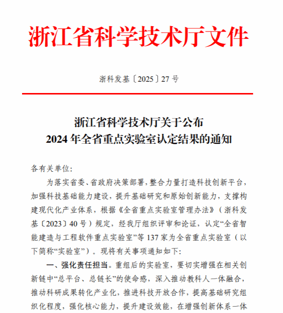 近日,浙江省科学技术厅公布了《关于2024年全省重点实验室认定结果的通知》(浙科发基〔2025〕27号),由球探足球比分直播